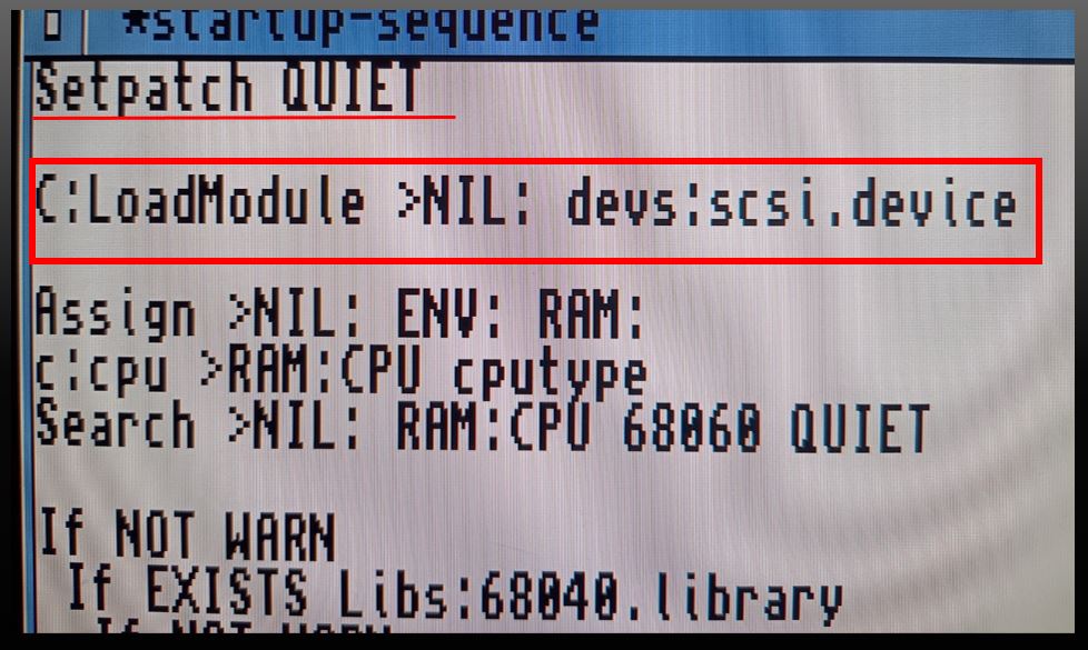 3. ) Füge „C:Loadmodule >NIL: devs:scsi.device“ zur startup-sequence direkt nach dem Kommand „Setpatch QUIET“ hinzu