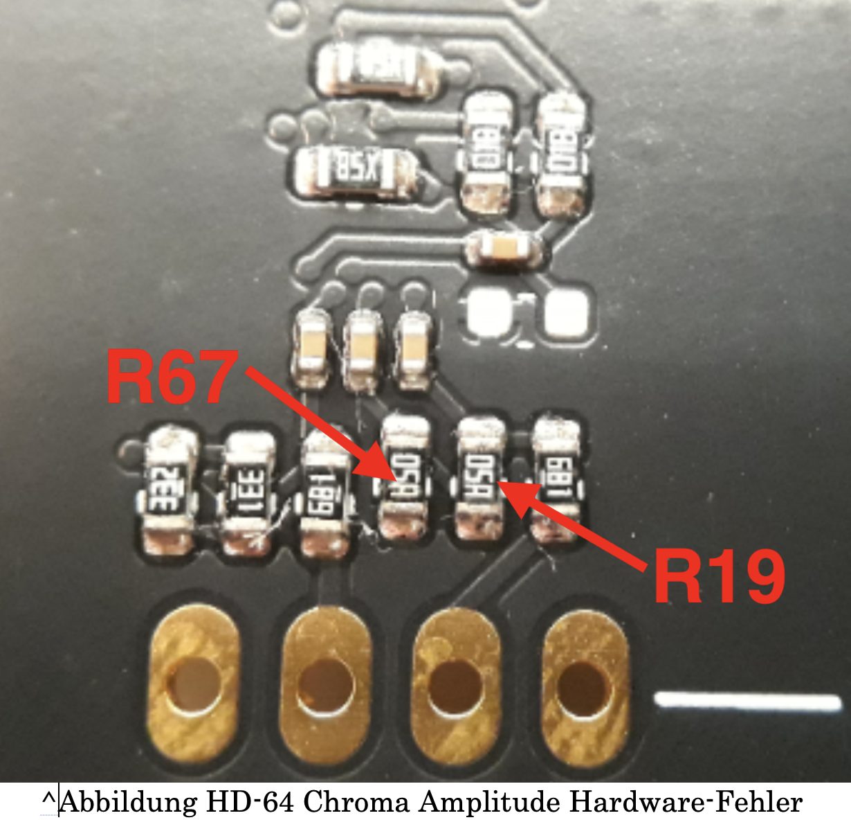 Ersetzen Sie R19 und R67 durch 220 Ohm bzw. 100 Ohm (Größe 0603) oder . Fügen Sie einen 680 Ohm 0603-Widerstand über R67 (also ohne die aktuellen Widerstände zu entfernen), sodass die Parallelschaltung des ursprünglichen 100-Ohm-Widerstands und des hinzugefügten 680-Ohm-Widerstands 87 Ohm ergibt, wodurch die Chroma-Amplitude wieder auf den richtigen Wert zurückgesetzt wird.
