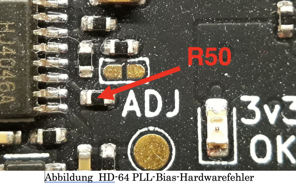 Der Widerstand R50 hat einen falschen Wert (22 kOhm), wodurch die PLL-Vorspannung niedriger ist als ursprünglich vorgesehen (1,5 V statt 2,1 V), jedoch innerhalb des zulässigen Bereichs (1 V bis 3 V) liegt.
