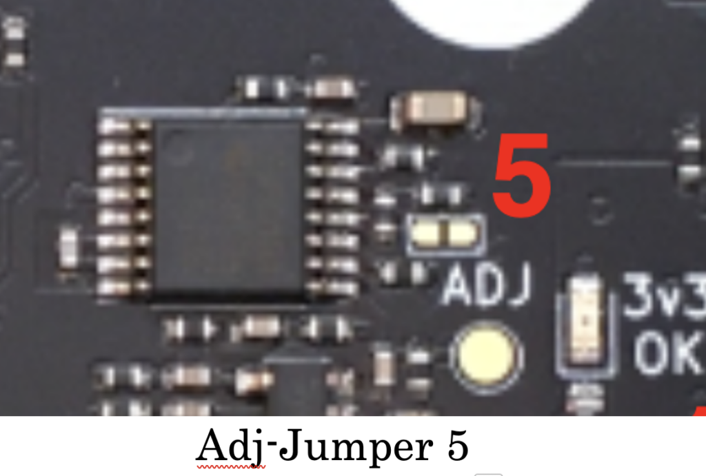 Vorgehensweise: Wenn die Spannung am Testpunkt in der Nähe des „Adj Jumper” unter 1 V fällt (bei geöffnetem Adj Jumper), muss R50 durch einen 33-kOhm-Widerstand 0402 ersetzt werden.