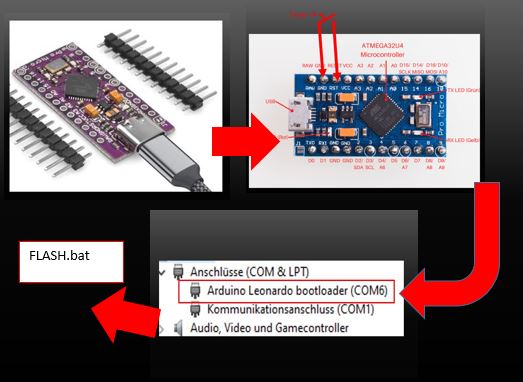 Bevor wir den Arduino Pro Micro flashen können, müssen wir wissen, welchen COM-Port Windows ihm zugewiesen hat. Verbinden Sie ihn mit einem geeigneten USB-Kabel mit Ihrem Computer.