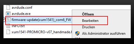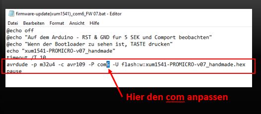 Mit dem Editor die firmware-update(xum1541)_com6_FW 07.bat bearbeiten